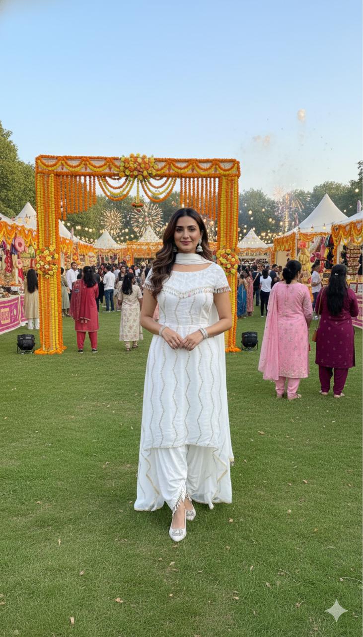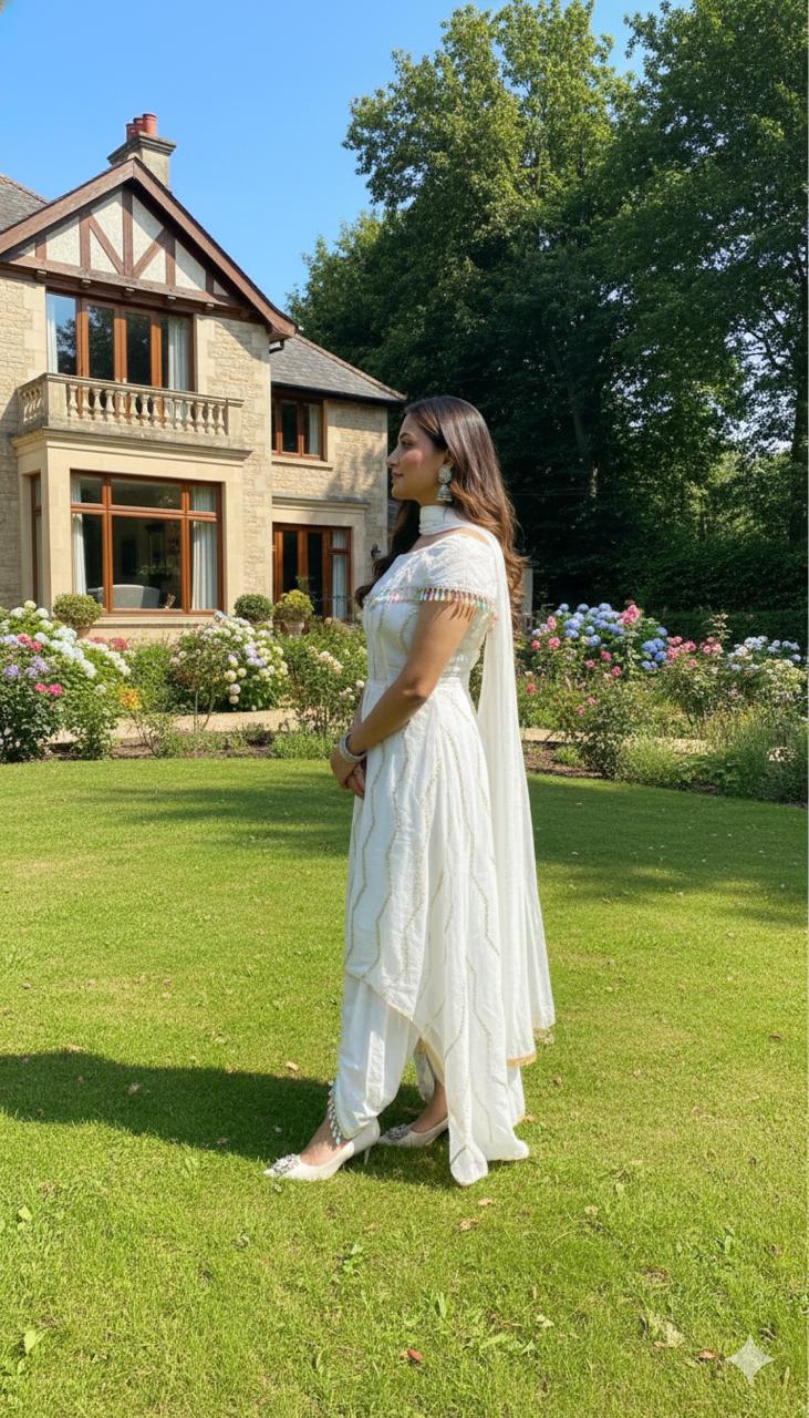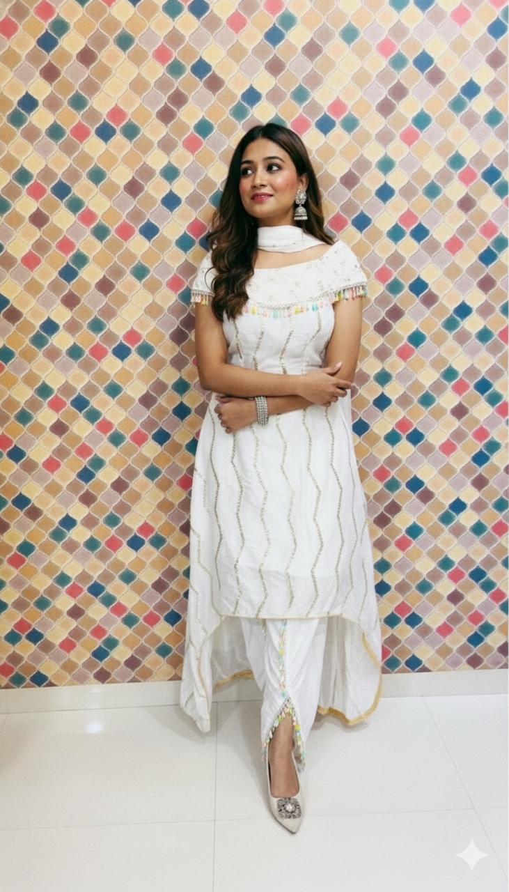 Step into effortless elegance with this stunning white Anarkali Kurta Set, featuring a chic collared kurta paired with trendy dhoti pants. Designed to blend modern style with traditional charm, this outfit ensures a graceful yet contemporary look.